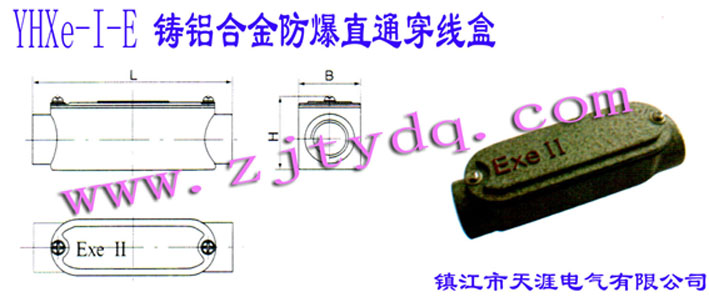 防爆電器 >> 防爆穿線盒 >> YHXe-I-E鑄鋁合金防爆直通穿線盒 AL-alloy Anti-explosion Pull Box of Straight Type 說明: 1、適用范圍: 爆炸性氣體混合物危險場所:1區(qū)、2區(qū) Danger places with gas mixture:Zone 1&2 爆炸性氣體混合物:IIA、IIB、IIC Explosive gas mixture: IIA、IIB、IIC 溫度組別:T1-T6 Temperature group:T1-T6 戶內(nèi)、戶外 indoor,outdoor 2、產(chǎn)品特點(diǎn): 外殼采用鑄鋁合金,表面噴塑 The closure is made of Cast Aluminum alloy with the surface painting 如需要變徑時可特制 It can be fabricated according to the special requirements 防爆標(biāo)志:ExeII Explosion-proof Mark:Exe II 防爆等級:IP55 Protection Grad:IP55 結(jié)構(gòu)形式多樣,便于安裝 Many kinds of structures are convenient for installation 3、YHXe防爆穿線盒根據(jù)客戶的要求,在不同的使用場所可選擇一下三種型號:There are three specifications for different purposes 1)、YHXe-I鑄鋁合金防爆穿線盒 YHXe-I Explosion-proof Box of Cast Aluminum Alloy 2)、YHXe-II鑄鐵防爆穿線盒 YHXe-II Explosion-proof Box of Cast Iron Alloy 3)、YHXe-III鑄鋼防爆穿線盒 YHXe-III Explosion-proof Box of Cast Steel Alloy